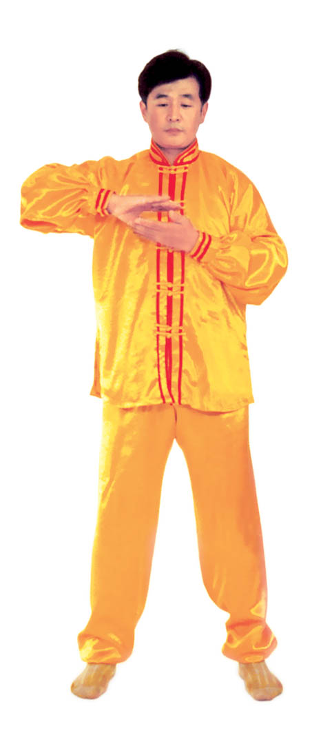 Chưởng chỉ càn khôn[5]: Bắt đầu từ thế “hợp thập”. Hai bàn tay tách ra, cách nhau chừng 2~3cm, đồng thời bắt đầu xoay bàn tay, nam tay trái (nữ tay phải) xoay hướng vào ngực, tay phải hướng ra ngoài ngực, hình thành tay trái ở trên, tay phải ở dưới và cẳng tay giống hình chữ “nhất” (nữ thì trái phải ngược lại), (như hình 1.6) Tiếp theo, cẳng tay trái duỗi thẳng chếch lên bên trái, bàn tay úp xuống, độ cao bàn tay ngang với đầu thì dừng; tay phải đặt chỗ trước ngực, bàn tay ngửa lên. Thuận theo khi tay trái dần dần tới vị trí, thì toàn thân cũng dần dần căng thẳng, đầu dựng lên, chân dẫm xuống. Tay trái duỗi thẳng phía chếch bên trái, tay phải ở trước ngực, bắp tay thẳng hướng phía ngoài (như hình 1.7). Duỗi khoảng 2~3 giây đồng hồ, rồi toàn thân lập tức buông chùng, tay trái lại thu về chỗ trước ngực và cùng với tay phải thành trạng thái “hợp thập”. Sau đó lại xoay bàn tay, triển khai tay phải (nữ tay trái) ở trên, tay trái ở dưới (như hình 1.8). Tay phải lặp lại động tác vừa rồi của tay trái, tức là cẳng tay duỗi chếch sang bên phải, bàn tay úp xuống, bàn tay có độ cao ngang đầu; tay trái vẫn ở chỗ trước ngực, bàn tay ngửa lên. Sau khi duỗi căng xong (như hình 1.9) toàn thân lập tức buông chùng. Thu tay về sau đó hai tay “hợp thập” trước ngực (như hình 1.5)