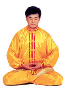 Trước lúc luyện công ý tưởng một chút rằng tự mình [như] là hai thùng rỗng rất cao lớn, sừng sững giữa trời đất, cao lớn không gì sánh được[16]. Khí bên trong [thân] thể thuận theo tay mà [chuyển] động lên xuống, xung lên khỏi đỉnh đầu, trực tiếp tới cực nơi cao nhất của vũ trụ; khí xung xuống sẽ qua từng chân mà xung ra, xung tới cực nơi thấp nhất của vũ trụ. Sau đó khí theo tay mà [chuyển] động, từ hai cực mà quay về trong [thân] thể, rồi lại xuất ra theo hướng ngược lại, lặp lại như thế chín lần. Khi xung quán tới lần thứ chín, thì tay trái (nữ tay phải) ở cực trên mà đợi tay phải (nữ tay trái) đưa lên. Sau đó [hai tay] đồng thời quay về hạ xuống quán nhập vào chỗ cực nơi thấp, [rồi lại] qua thân thể mà xung quán lên, sau khi lặp lại chín lần thì thu khí trở về. Sau khi thu trở lại, thì ở chỗ bụng dưới mà xoay chuyển Pháp Luân theo chiều kim đồng hồ, làm cho khí bên ngoài [thân] thể xoay trở về bên trong [thân] thể, sau đó kết ‘định ấn’[17], luyện công xong thì thu thế chứ không thu công.